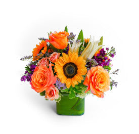 August's End honors that poignant moment when summer's warmth begins to fade into autumn's promise. Golden sunflowers radiate the season's final brilliance, paired with warm orange roses and cheerful yellow asiatic lilies, all enhanced by rich purple accents that whisper of cooler days ahead. This nostalgic arrangement captures the bittersweet beauty of transition—celebrating the harvest season's generous abundance while gracefully acknowledging nature's gentle shift. Perfect for those who find meaning in seasonal change, this bouquet speaks to the soul of anyone who treasures life's meaningful moments. Give August's End to mark the passage of time with elegance, or simply to remind someone that every ending brings its own quiet beauty and new beginnings.
